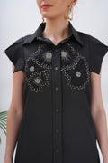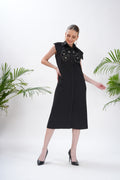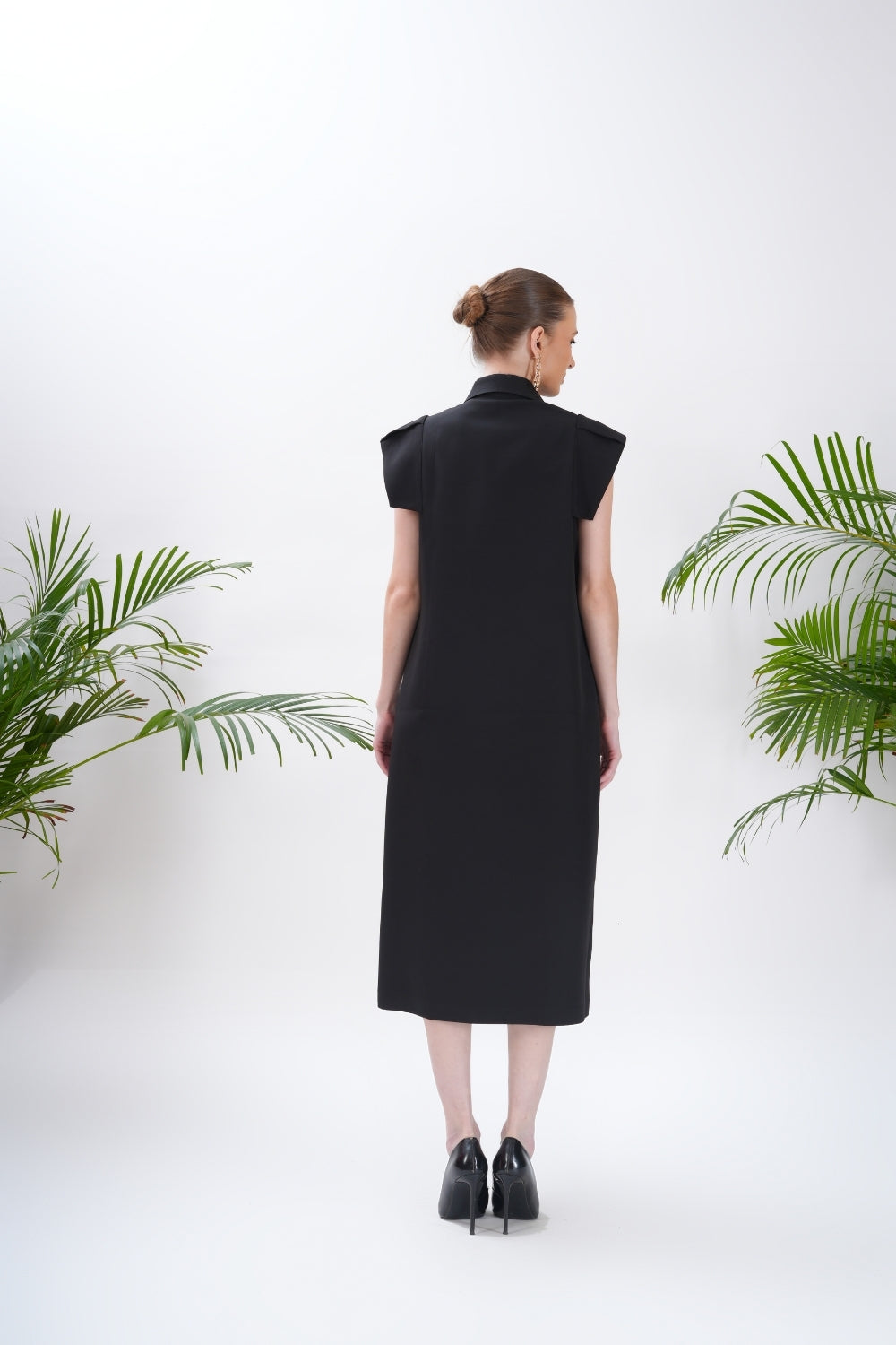 Timeless sophistication meets modern structure in the Classic Black Side Button Dress. Crafted from soft yet structured banana crepe, this sleeveless shirt-dress silhouette features a tailored fit with elegant detailing — including flap pockets, shoulder tabs, and a refined side button closure that enhances the sleek, straight-line silhouette.