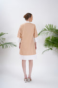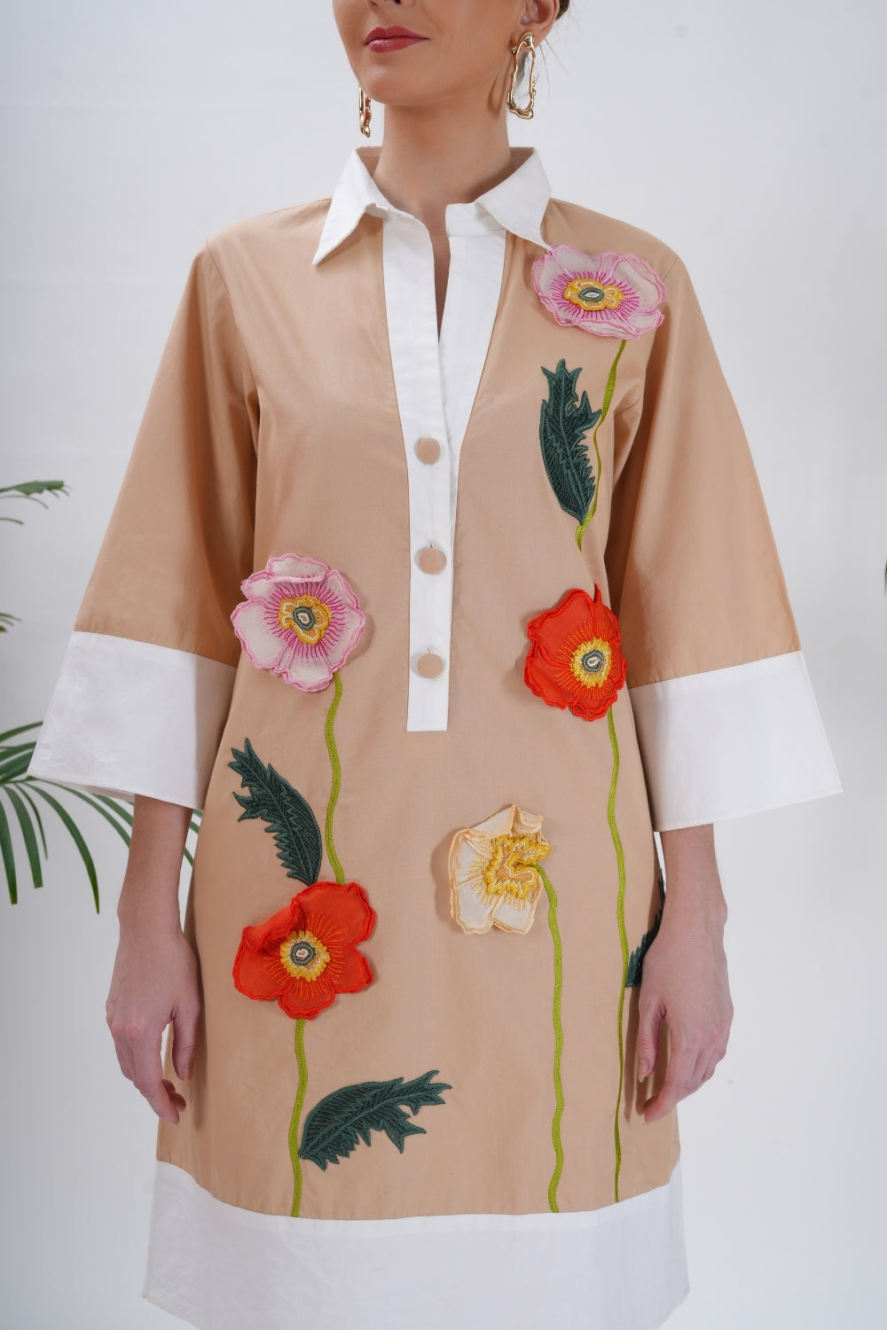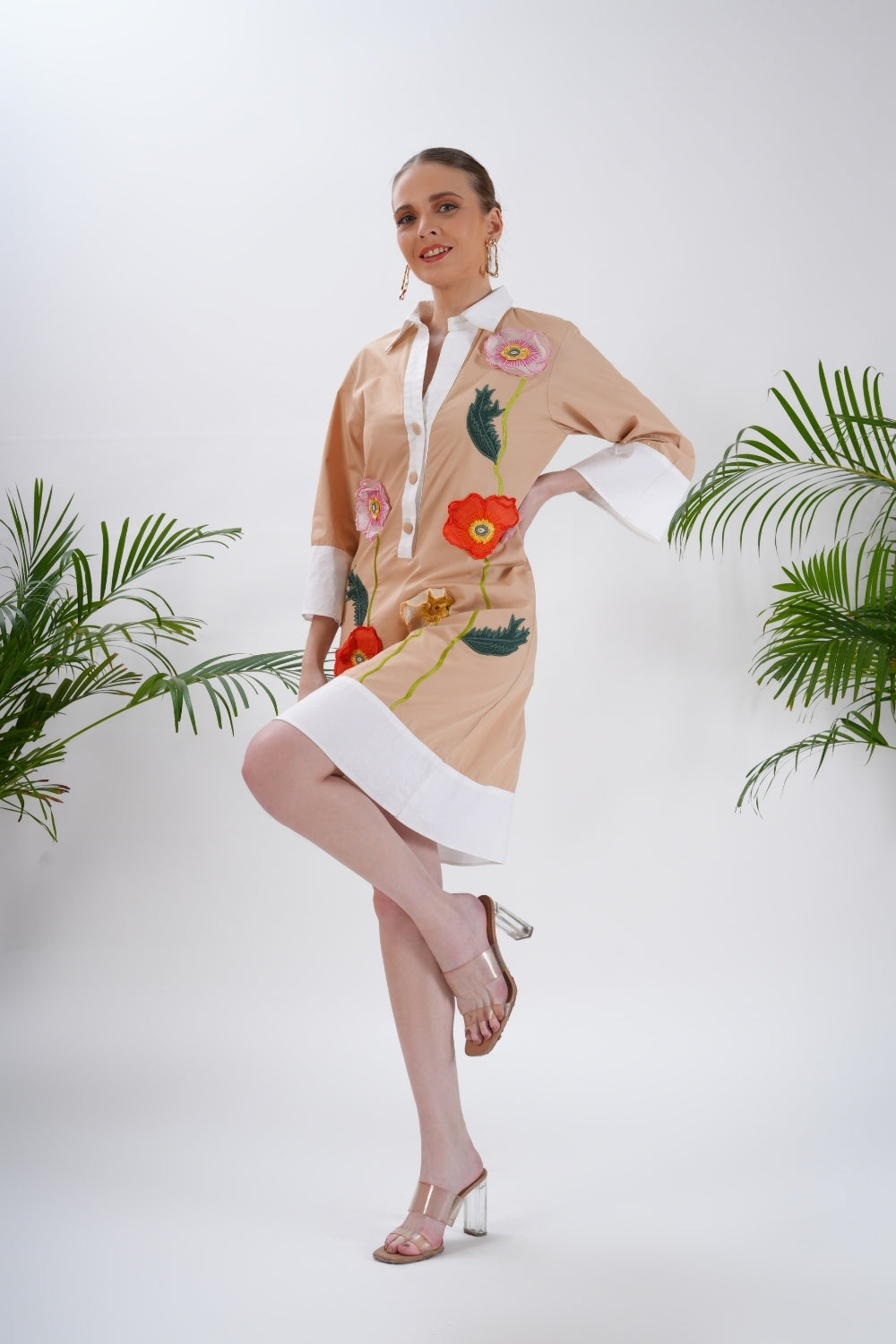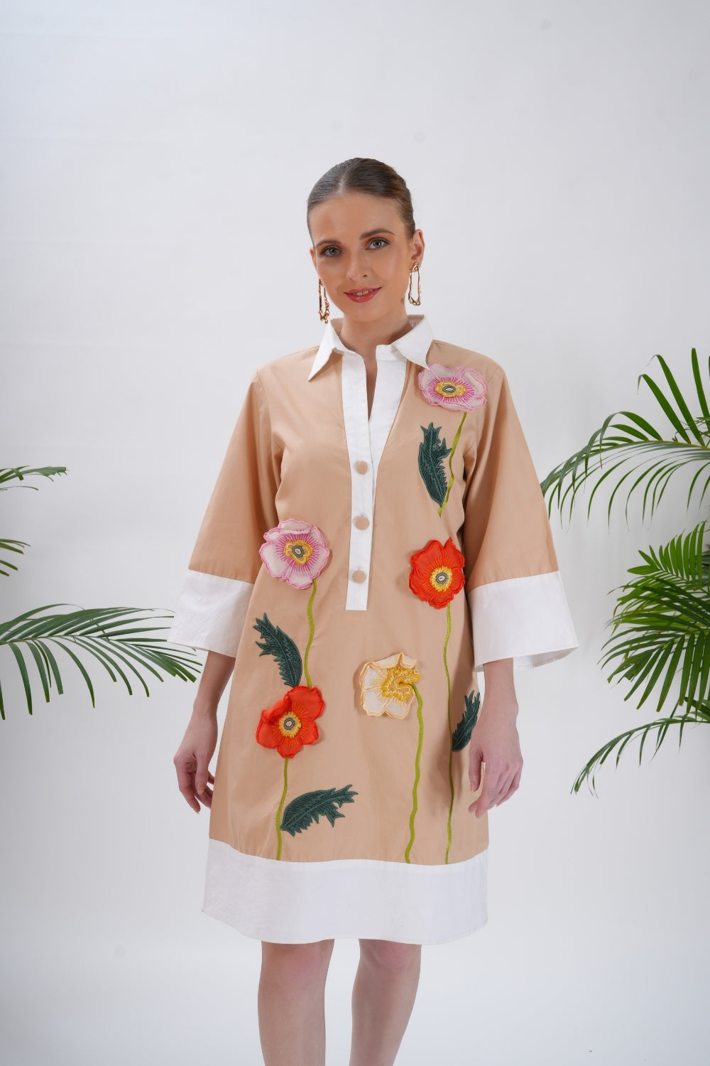 The neutral peachy base is elevated with vibrant floral appliqué detailing in coral, yellow, and pink, creating a fresh, garden-inspired look. Perfect for daytime outings, luncheons, or casual summer gatherings, this dress pairs effortlessly with sandals or heels for an easy, put-together ensemble.